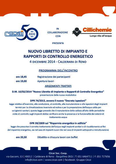 Giovedì 4 dicembre 2014 a partire dalle 19.00, presso la sede Ciicai di Calderara di Reno, si svolgerà un incontro di formazione interna dedicata ai prodotti del marchio Cillichemie.